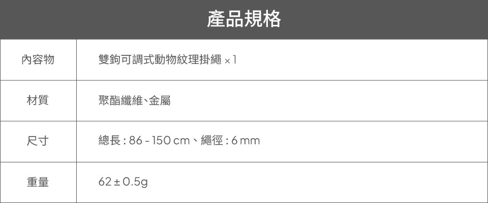 雙鉤可調式動物紋理掛繩